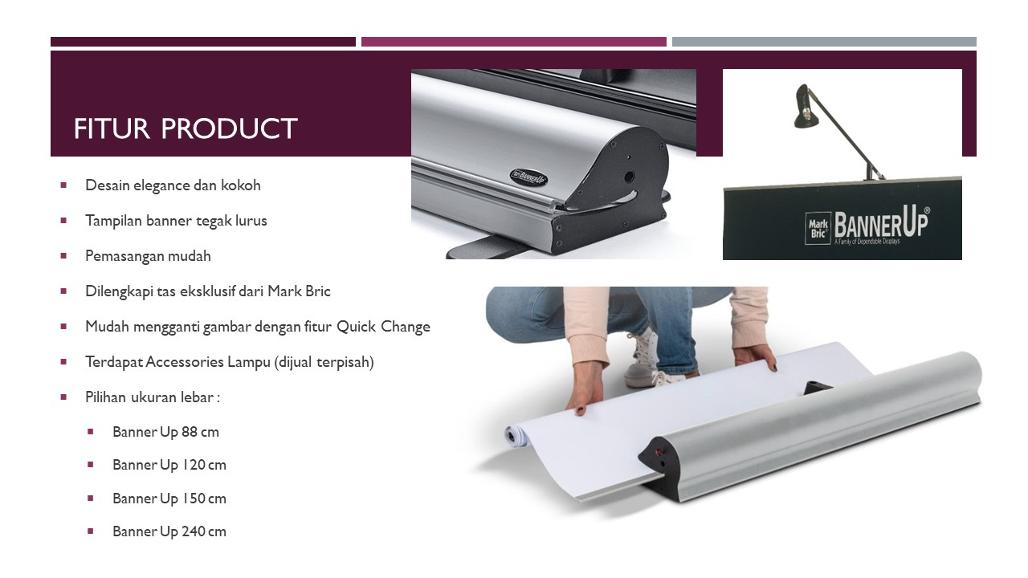 Merupakan produk Rolling Banner dengan kualitas terbaik yang ada di pasaran saat ini. Dibuat oleh Mark Bric Swedia dengan Material Alumunium yang kuat dan kokoh.