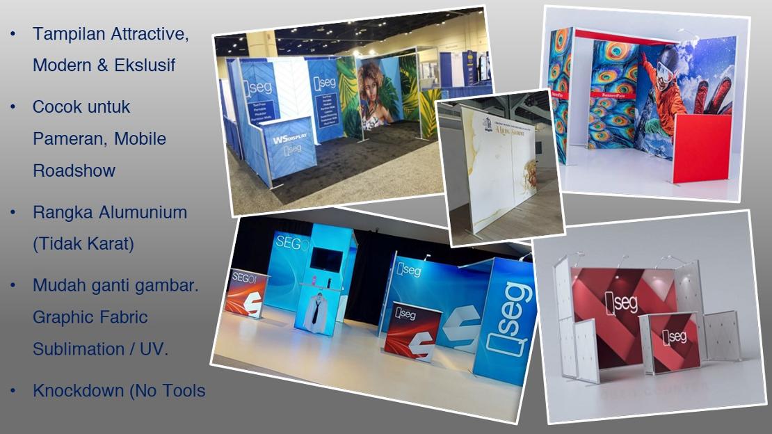 Merupakan Display System Modular untuk Pameran / Tradeshow / Roadshow yang bentuknya Modern / Slim / Rapi dengan Graphic Fabric ( Kain Textile + Silicon Edge). Rangka Alumunium Profile Ringan dan anti karat dan Knockdown tanpa butuh bantuan alat untuk pemasangan dan mudah dalam mobilisasi karena penyimpanan ringkas dalam tas