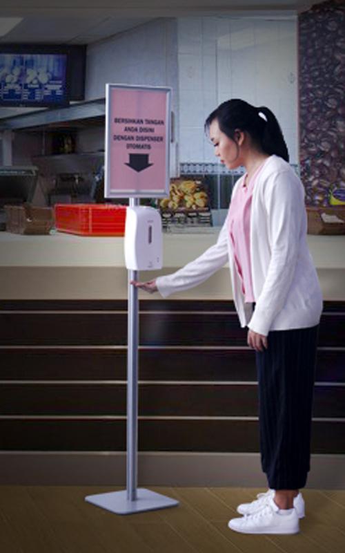 Produk sanitizer dengan sistem spray yang disemprotkan secara otomatis dengan tenaga baterai dilengkapi dengan stand berbahan alumunium, membantu mengurangi terjadinya penularan kuman atau pun bakteri jahat di area publik.