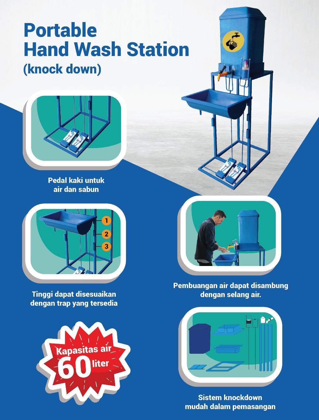 Produk sanitizer dengan sistem Knock Down injakan kaki yg dapat di operasikan tanpa menyentuh apapun ( sabun dan kran) dilengkapi dengan pengaturan ketinggian pada bak penampungan dan dilengkapi kapasitas air sebesar 60 liter.